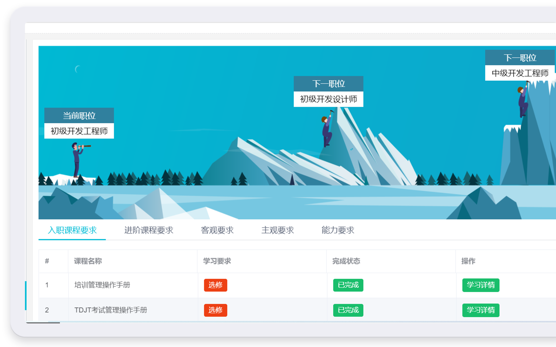 基于企業(yè)大學(xué)運作模式構(gòu)建,在滿足企業(yè)常規(guī)的培訓(xùn)計劃、過程實施、效果評估、學(xué)分管理、師資課程等資源管理的基礎(chǔ)上,結(jié)合企業(yè)人才職業(yè)發(fā)展通道和職位任職資格,提供促進員工能力提升的培訓(xùn)課程體系設(shè)計、PC端/移動端結(jié)合的在線學(xué)習(xí)、在線考試等應(yīng)用服務(wù),