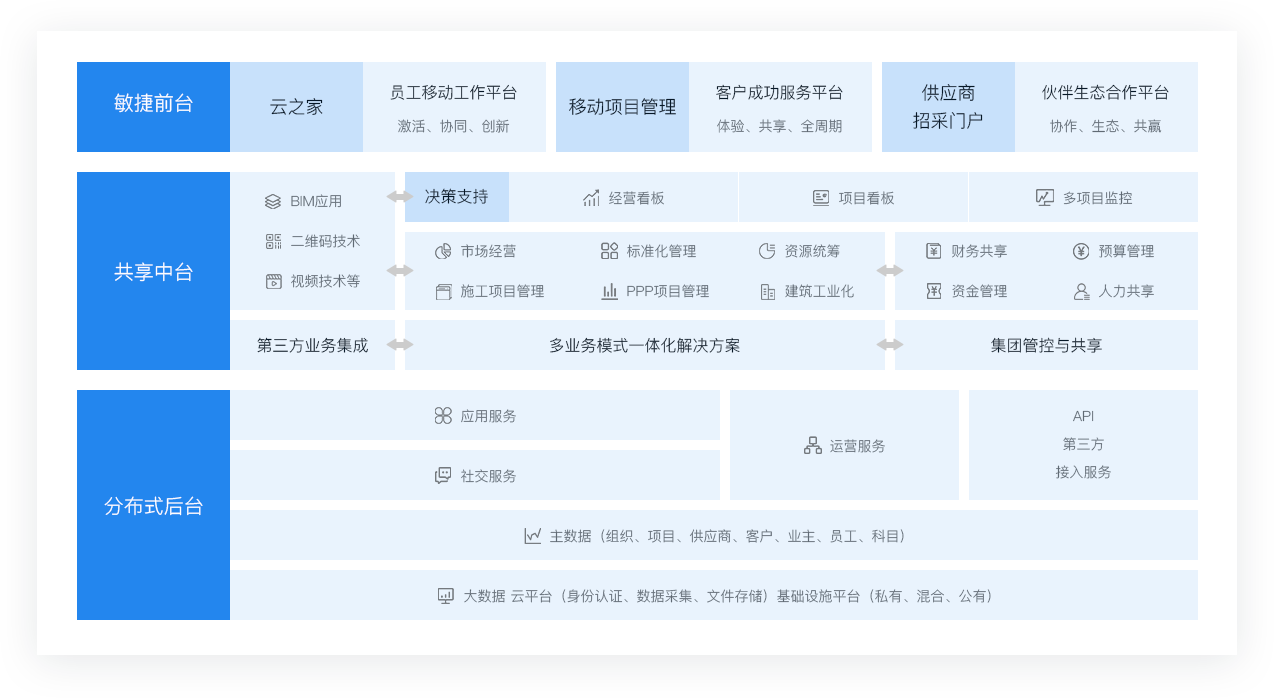 支持建筑企業(yè)產(chǎn)業(yè)鏈一體化、多元化發(fā)展戰(zhàn)略與商業(yè)模式的創(chuàng)新,為企業(yè)打造了一個(gè)多業(yè)務(wù)模式、產(chǎn)業(yè)鏈一體化、共享與生態(tài)的企業(yè)統(tǒng)一信息化管理平臺(tái)