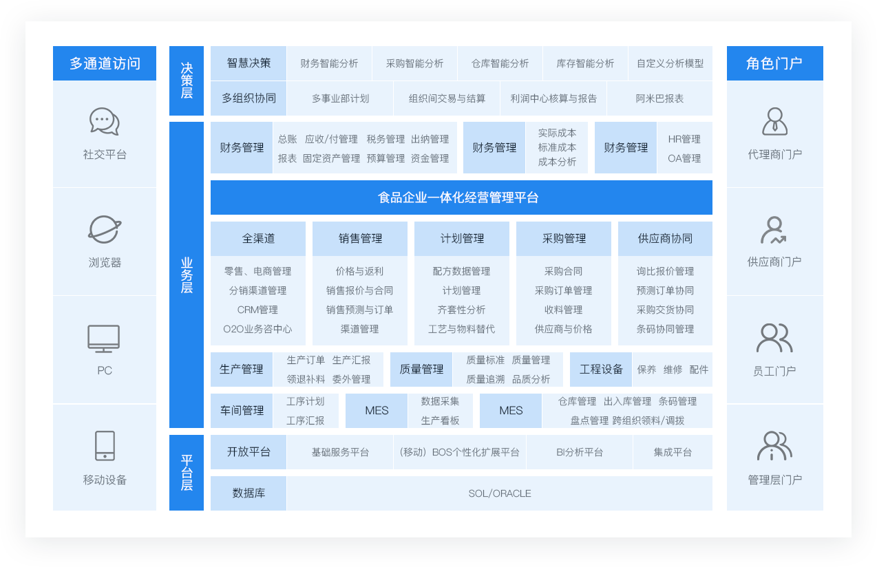 通過(guò)一體化經(jīng)營(yíng)管理平臺(tái)給每個(gè)角色提供多通道訪問(wèn)的門(mén)戶,支撐從決策到業(yè)務(wù)執(zhí)行的落地。幫助食品企業(yè)形成產(chǎn)銷(xiāo)一體化,業(yè)財(cái)一體化,管控一體化的企業(yè)管理平臺(tái),支撐食品企業(yè)業(yè)務(wù)模式的快速?gòu)?fù)制和擴(kuò)張